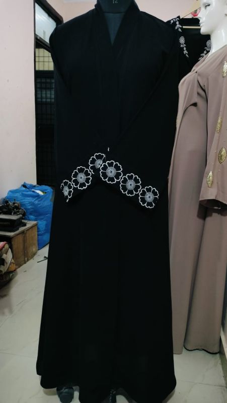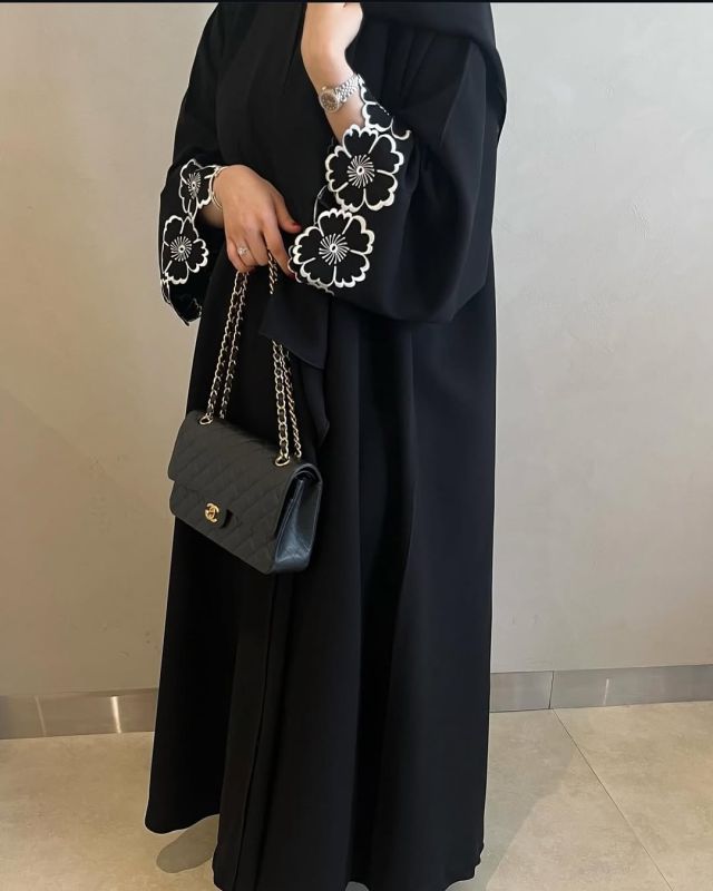 This modest abaya is a front open black garment featuring elegant white floral embroidery across the front. It is designed to combine both modesty and sophisticated style, typically made of premium fabrics like Nida, crepe, or zoom, providing a comfortable yet luxurious look suitable for everyday wear or special occasions. The open front style allows for versatile layering and a graceful silhouette, while the delicate white floral embroidery adds a unique and eye-catching detail.