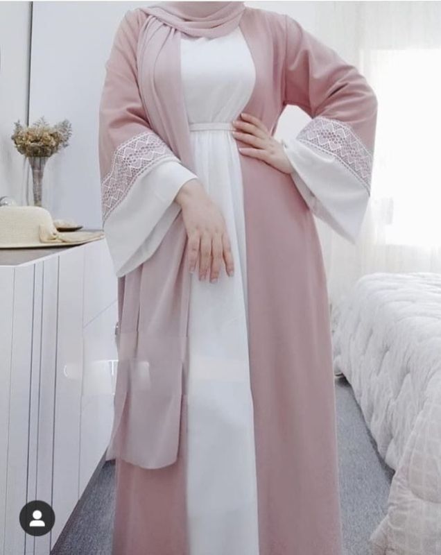 - The dress is a full-length, loose-fitting abaya featuring a simple white inner dress as the base layer.